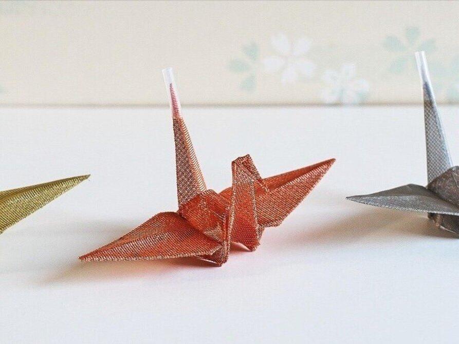 金属メッシュで小松さんが折り鶴(鹿田式)を作りました。