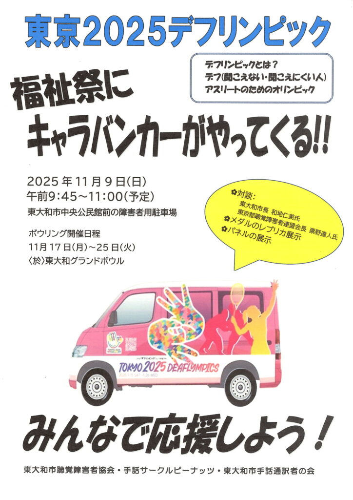 2025年11月5日 / 最終更新日時 : 2025年11月5日 菊花仙人 イベント デフリンピックキャラバンカーがやってくる 福祉祭にキャラバンカーがやってくる 11月9日(日)午前9:45~11:00(予定) 中央公民館前の障害者用駐車場 EPSON MFP image Follow me! 菊花仙人共有:Tweetいいね:いいね 読み込み中... 関連 FacebooktwitterHatenaPocket