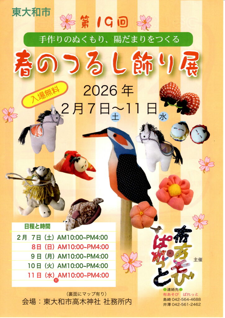 2026年1月20日 / 最終更新日時 : 2026年1月20日 菊花仙人 イベント 春のつるし飾り展 第19回 春のつるし飾り展 期日:2月7日(土)~11日(水・祝)AM10:00~PM4:00 場所:東大和市高木神社 社務所内 主催:布あそびぱれっと EPSON MFP image EPSON MFP image Follow me! 菊花仙人共有:Tweetいいね:いいね 読み込み中... 関連 FacebooktwitterHatenaPocket