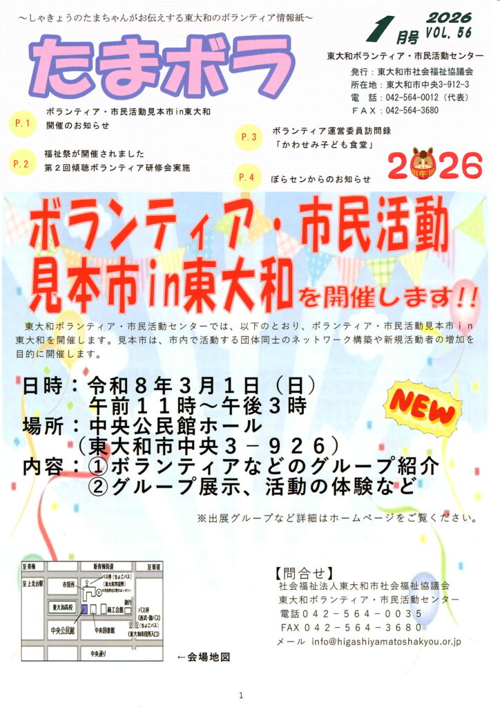 2026年2月18日 / 最終更新日時 : 2026年2月18日 菊花仙人 イベント ボランテイア・市民活動見本市in東大和 ボランティア・市民活動見本市in東大和 ~ボランティァ活動紹介など~ 日時:3月1日(日)午前11時~午後3時 場所:中央公民館ホール 内容:①ボランテイアなどのグループ紹介 ②グループ展示、活動の体験など EPSON MFP image Follow me! 菊花仙人共有:Tweetいいね:いいね 読み込み中... 関連 FacebooktwitterHatenaPocket