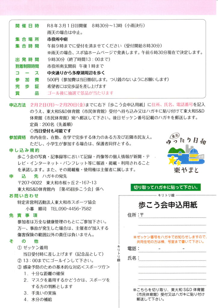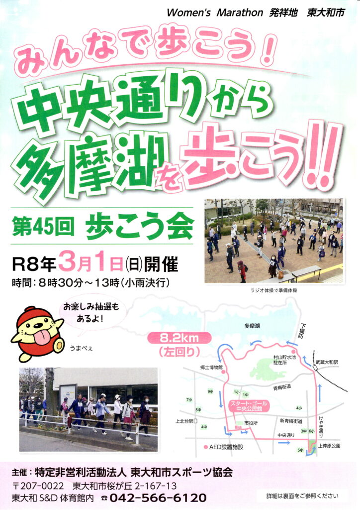 2026年2月22日 / 最終更新日時 : 2026年2月22日 菊花仙人 イベント 中央通りから多摩湖を歩こう!! 第45回歩こう会 日時:3月1日(日)8時30分~13時(小雨決行) 集合場所:市役所中庭 集合時間:9時までに受け付け 出発時間:9時30分(終了時間13時) 参加費:500円 主催:特定非営利活動法人 東大和市スポーツ協会 EPSON MFP image EPSON MFP image Follow me! 菊花仙人共有:Tweetいいね:いいね 読み込み中... 関連 FacebooktwitterHatenaPocket
