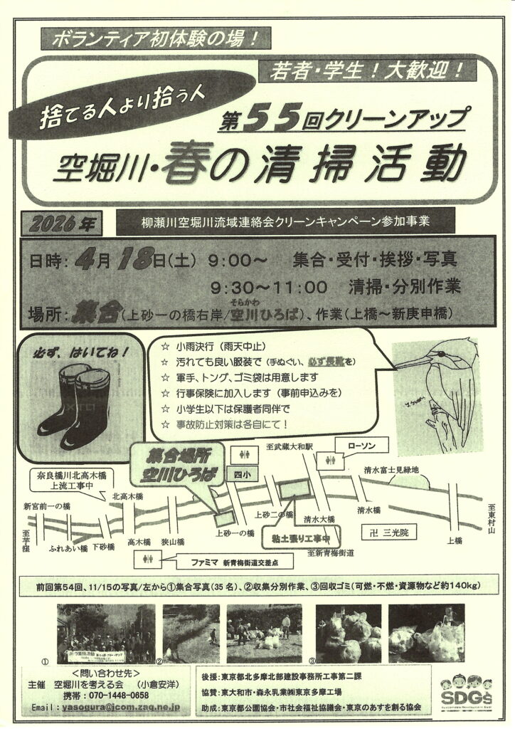 2026年4月3日 / 最終更新日時 : 2026年4月3日 菊花仙人 イベント 空堀川・春の清掃活動 第55回クリーンアップ 空堀川・春の清掃活動 日時:4月18日(土)9:00~集合・受付・挨拶・写真 9:30~11:00 清掃・分別作業 場所:集合(上砂一の橋右岸/空川広場)作業(上橋~新庚申橋) EPSON MFP image Follow me! 菊花仙人共有:Tweetいいね:いいね 読み込み中... 関連 FacebooktwitterHatenaPocket
