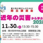 2025年10月27日 / 最終更新日時 : 2025年10月27日 portal@higashiyamato サークル紹介 【断層の会主催】防災講演会(11/30)のご案内 断層の会と東京防災学習セミナー事務局(東京都)の主催する防災講演会(近年の災害から学ぶ2025)が中央公民館で開催されます。参加は無料です。 portal@higashiyamato