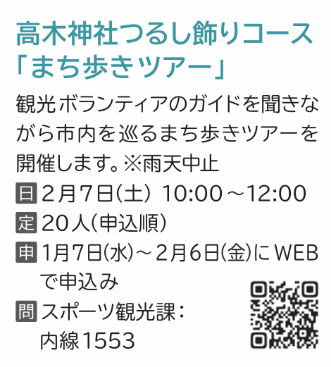 2026年1月26日 / 最終更新日時 : 2026年1月26日 佐藤 歩く 「つるし飾りコース」まち歩きのお知らせ つるし飾り(高木神社社務所) 2月7日(土)奈良橋・高木地区を歩き、高木神社社務所で開催中のつるし飾りを見学する「つるし飾りコース」を実施します。 応募要項 高木神社で全員集合 つるし飾り Follow me! 佐藤 東やまと観光ガイドの会が開催するイベント情報や、観光ポイントを紹介します。 共有:Facebook で共有するにはクリックしてください (新しいウィンドウで開きます)クリックして Twitter で共有 (新しいウィンドウで開きます)